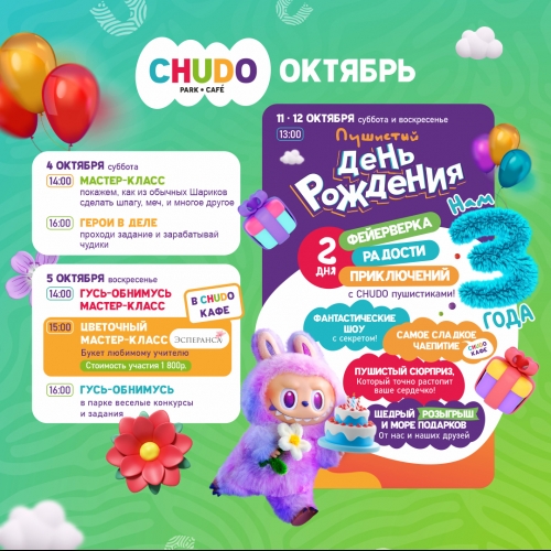 Друзья, октябрь — это не просто золотая осень, это целая вселенная приключений, которая ждет вас в CHUDO Парке! Мы собрали для вас всю магию этого времени года: от уютного творчества до самых бесшабашных игр на свежем воздухе.
