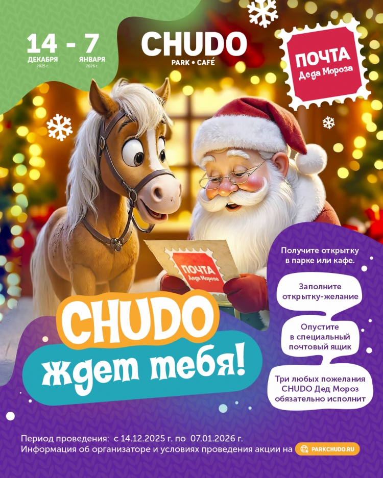 С 14 декабря по 7 января CHUDO Парк и CHUDO Кафе превращаются в настоящую волшебную резиденцию. Мы запускаем самое доброе и долгожданное предновогоднее событие — официальную Почту Деда Мороза. Приходите, чтобы отправить ему своё заветное желание!