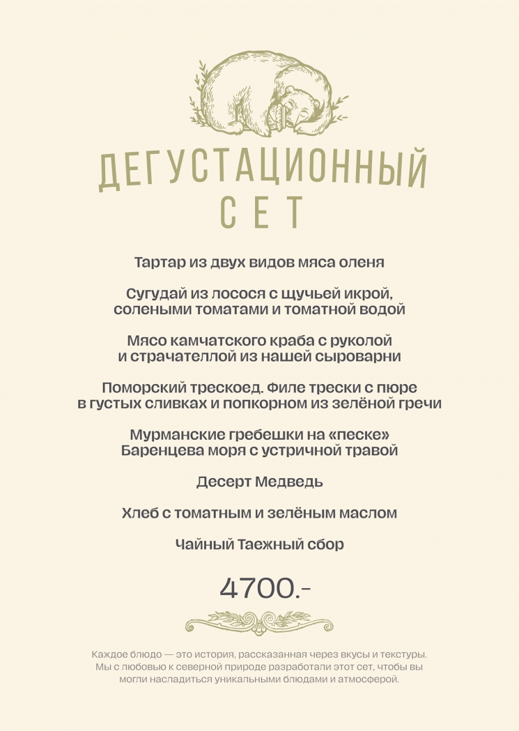 Каждое блюдо в сете - это история, рассказанная через вкусы и текстуры. Шеф-повар Максим Волков с любовью к северной природе создал этот сет, чтобы вы могли насладиться уникальными вкусами и атмосферой.