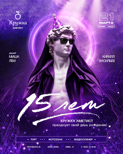 Зовите друзей, заряжайтесь настроением и готовьтесь к улётной ночи в честь 15-летия Кружки Аметист. Будет шумно, весело и очень фиолетово