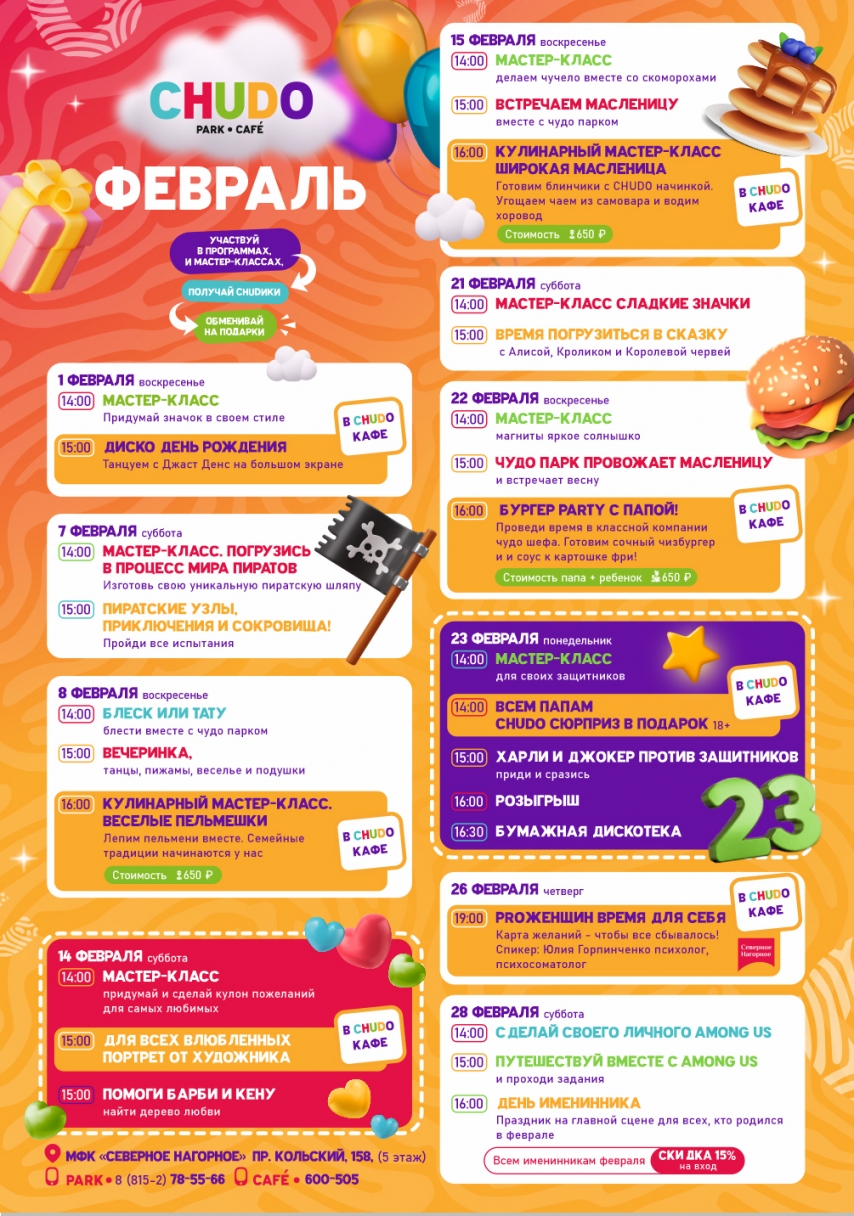 Устали от скучных выходных? Мы превратили каждый день февраля в яркое событие для вашей семьи! В нашем парке и кафе — не просто вкусная еда, а целая вселенная приключений, творчества и праздников. Выбирайте тему по душе: широкая Масленица, пиратские баталии, сказочное путешествие с Алисой или вечеринка с Among Us. Мы гарантируем: детский восторг и ваши спокойные выходные — в одном флаконе!