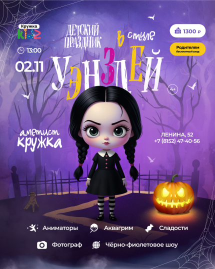 Ждем вас на самую мрачную и загадочную детскую вечеринку в стиле Уэнсдей в Кружке Аметист!