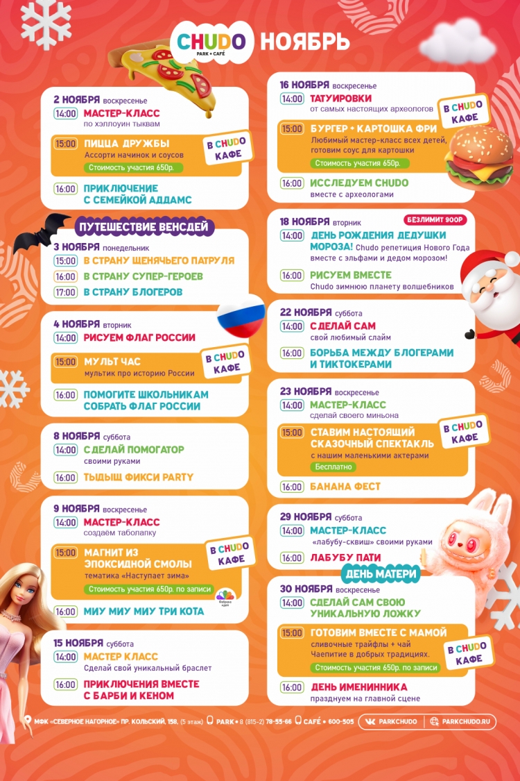 Семейный парк CHUDO представляет насыщенную программу на ноябрь. Мы разделили месяц на тематические недели, чтобы каждый нашел событие по душе!