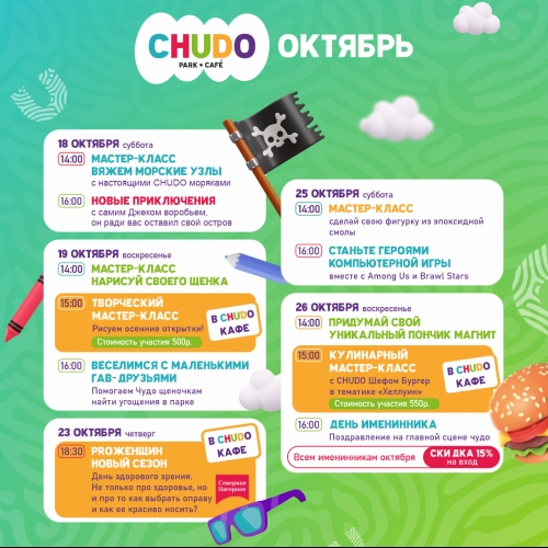 Друзья, октябрь — это не просто золотая осень, это целая вселенная приключений, которая ждет вас в CHUDO Парке! Мы собрали для вас всю магию этого времени года: от уютного творчества до самых бесшабашных игр на свежем воздухе.