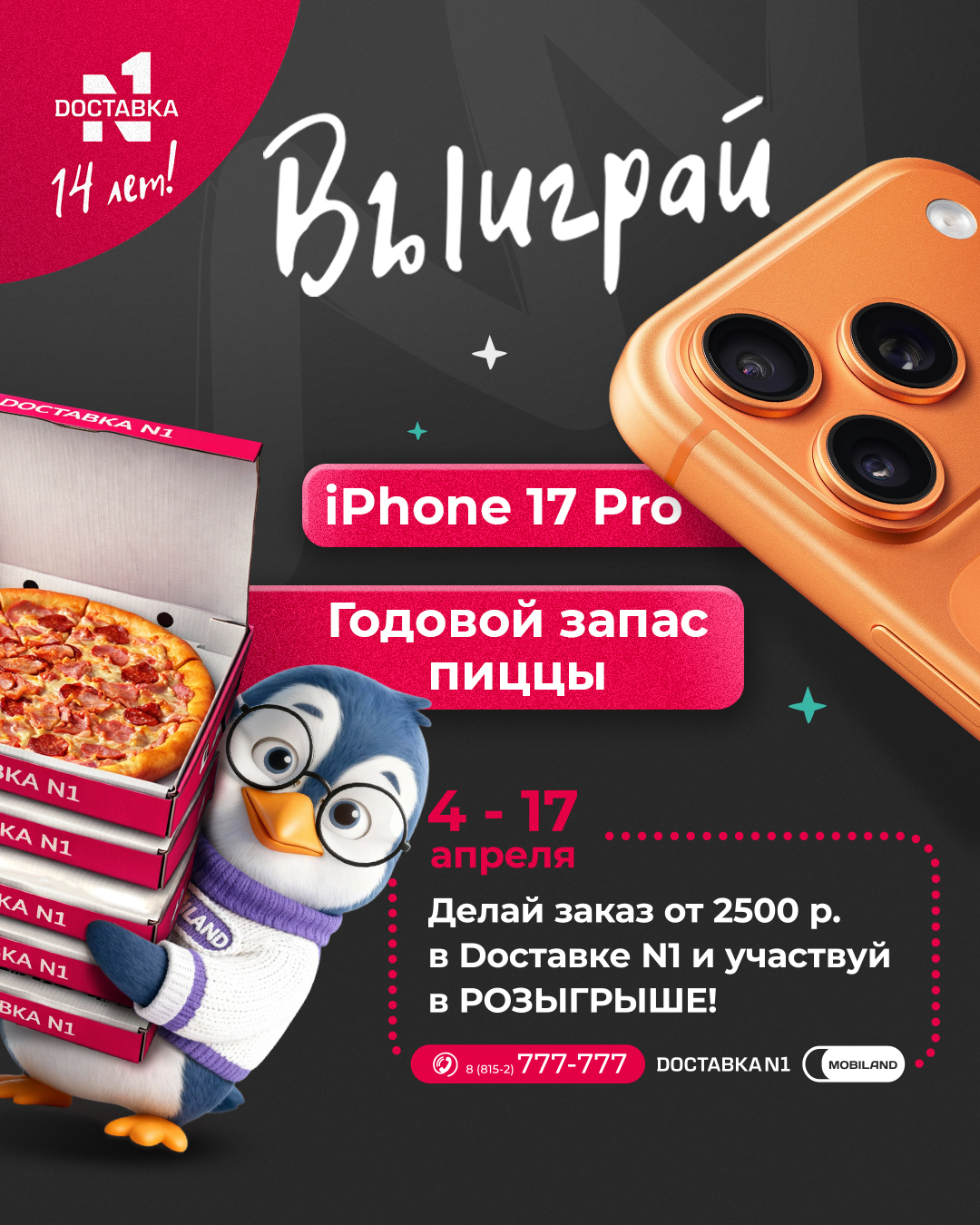 Доставке N1 -14 лет! Выиграй Айфон 17 или годовой запас пиццы!