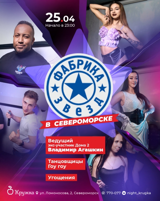 25 апреля в Кружке Североморск будет не просто тусовка — будет ФАБРИКА ЗВЁЗД, где скромность остаётся за дверью, а на сцену выходят только те, кто умеет жить громко
