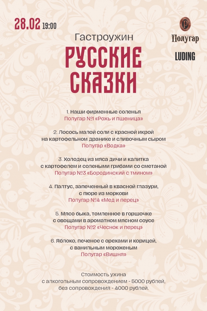 Стоимость участия: 4000₽ без алкогольного сопровождением / 5000₽ все включено